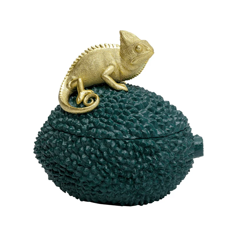 Decorative Chameleon box in dark green and gold Decorative objects are like pieces of jewellery: They make the look of a room perfect because they tell of the dreams of the occupants and because a well-chosen decorative object makes exciting style breaks very easy. Just like this decorated Chameleon box with lid made of artificial stone, which makes a grand entrance on the hall dresser, in the bedroom and on the sideboard in the living room.
