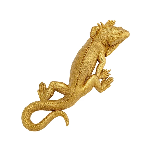 Lizard wall object made of gold-coloured lacquered polyresin This golden Lizard wall decoration brings stylish, creative accents to any room. An unusual gift idea for reptile lovers and anyone who appreciates special decorations. The lizard can be hung vertically on the wall.