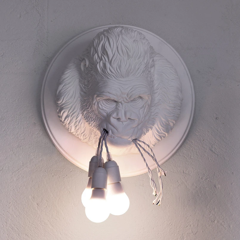 Gorilla head made of plaster: Designer wall light Ugo Rilla The gorilla with the three torn-off lamp pendulums in its mouth looks evil. You can literally feel the anger that drove him to destroy one of mankind's greatest inventions - electric light. However, in the case of this designer wall light called Ugo Rilla, he did not quite succeed in destroying it, as the three pendulums he tore apart are still lit and the sockets can be fitted with E27 bulbs and made to light up again. The manufacturer recommends using plastic bulbs. Exceptional designs are the trademark of the Italian bulb manufacturer Karman, which is based in Fossombrone in the central Italian province and also produces there. The products epitomise Italian design and craftsmanship.