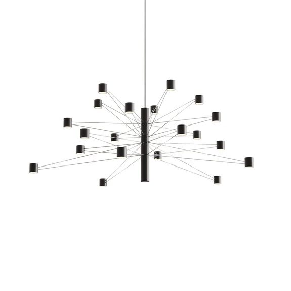 The POLAR 20.2 LED pendant light, designed by Yonoh Creative Studios, combines stylish design with functional lighting. Slender steel arms extend outwards from the central cylindrical structure made of black lacquered ABS plastic, supporting a total of 20 round lampshades. The integrated LED light sources produce warm white light that is emitted upwards and downwards. This provides living and dining rooms as well as prestigious public areas with both direct and indirect lighting. The POLAR 20.2 LED pendant light can also be dimmed externally (0-10V / 1-10V / PUSH / DALI).