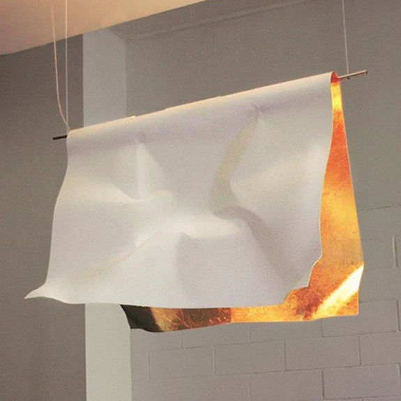 Fancy design pendant lamp Stendimi with gold leaf decorationA special luminous object is the one-metre long and 75 cm wide pendant lamp Stendimi, which attracts all eyes with an impressive design. It is made of handmade steel and completely covered with gold leaf on the inside. The outside, on the other hand, is kept in plain white. Two 200 cm long steel cables hold the lamp on the ceiling, from where it spreads a glamorous atmosphere in the room.Like each of the lamps of the Italian manufacturer, this one is also completely handmade. The manufacturer stands for high-quality workmanship in combination with traditional craftsmanship and innovative design. This results in special luminaires that emphasise the ambience of any room in a special way.