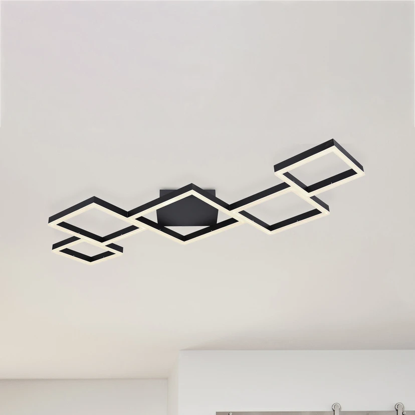 The Kurio LED ceiling lamp combines a modern and stylish design with functional features. It is made of iron and acrylic and presents itself in a coherent black colour scheme. On its ceiling mount sit five frames, which are equipped with LEDs and act as lampshades. These LEDs can be dimmed with the help of a remote control or a wall switch and shine in different light colors. Thus, it is possible for the LED ceiling light Kurio to provide the right brightness and ambience at any moment. In addition, the lamp has a memory function, with the help of which a previously made setting can be recalled when switched on again.
