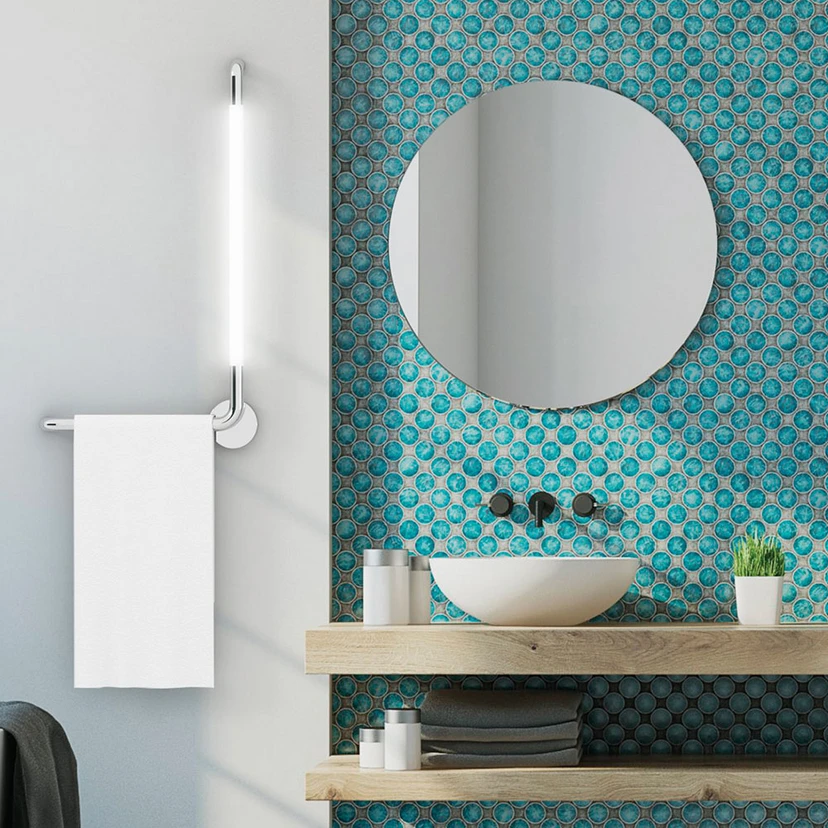 LED bathroom wall light Tubus with practical towel holder The LED wall light Tubus is ideal for mounting next to a mirror in the bathroom. The chrome-coloured body of the light runs at right angles and is rod-shaped. The vertical arm is fitted with warm white LEDs along almost its entire length, while the horizontal arm serves as a practical towel holder. Thanks to the slight distance to the wall, something can be hung up comfortably here, which means that the Tubus light solves two problems in the bathroom at once - sufficient light at the mirror and a holder right next to the washbasin. The light is protected against splashing water thanks to its IP44 rating.