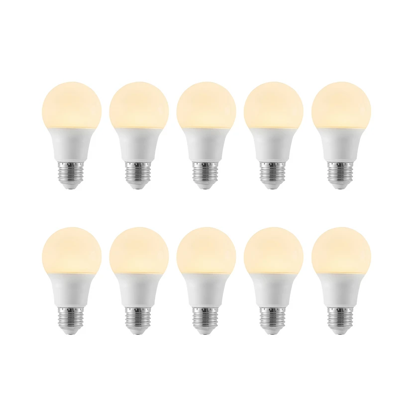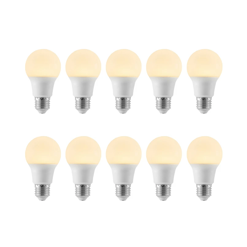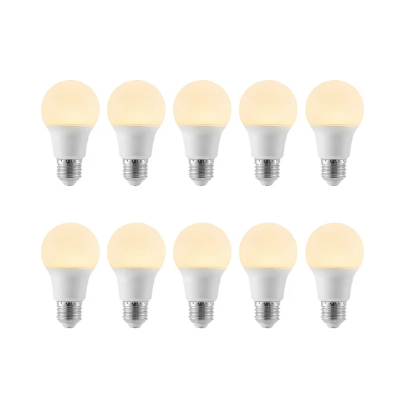 Opal white LED lamp E27 A60 8W with warm white light color (3,000 K) in a set of 10This LED lamp made of polycarbonate is very robust and can be used as a replacement for a conventional incandescent lamp of 60 W in many lights. It is not dimmable.- the LED lamp is supplied in a practical set of 10