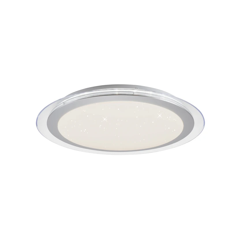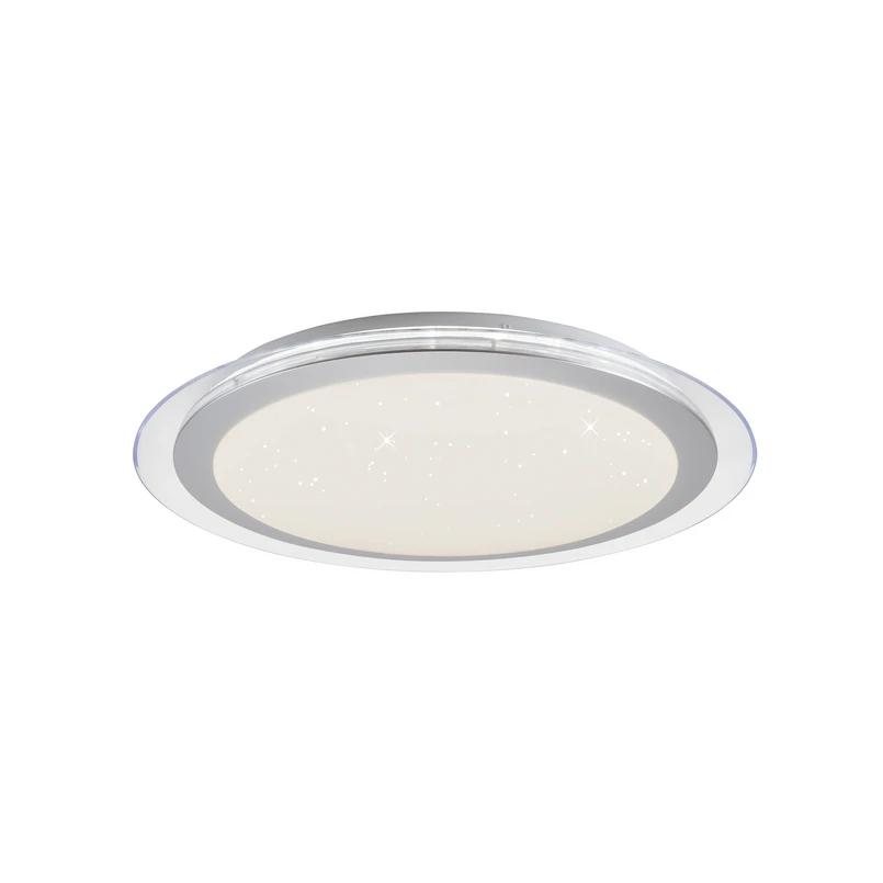 Cyba round LED ceiling light with remote control, CCT function, dimmable, RGB sidelight The Cyba LED ceiling light is an attractive source of light with a silver accent. The downward-facing diffuser has numerous small openings that create a starry sky effect. There is also another light source on the edge that shines in bright colours. The light is controlled using the enclosed remote control (incl. 2 x AAA batteries). This can be used to select the light colour of the sidelight; the main light source is dimmable and can also be adjusted from warm white to cool white, and there is also a night light function. Young and dynamic values characterise the JUST LIGHT. brand. - formerly known as Leuchten Direkt.
