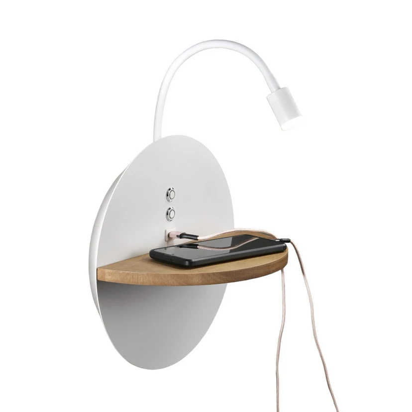 Functional Dual LED reading lamp with separately switchable light sources The Dual LED wall-mounted reading lamp is a very practical lighting element with an attractive design. It is equipped with a backlight that provides soft, indirect light behind its round housing and a movable spot that can be used wonderfully as a reading light. There is also a Massive oak shelf that can hold a load of up to 2 kg. Thanks to the USB charging socket, you can easily charge your smartphone or similar device. The two light sources can be switched and dimmed separately. This is done easily using the integrated buttons - USB output DC 5V 2A