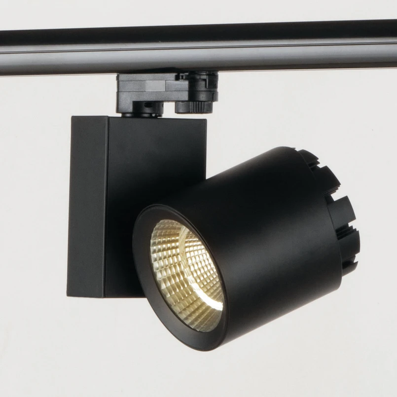 High-brightness Train LED track spotlight for three-circuit track The Train spotlight focuses on high light output. Its cylindrical head is equipped with a powerful, warm white COB LED, whose light is emitted into the room without loss thanks to a reflector and a clear cover. In addition, the swivelling head, the rotatable mounting and the sliding track carriage provide a high degree of flexibility.