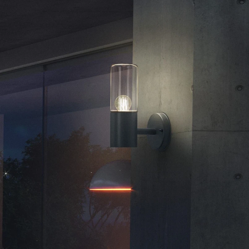 Endura Classic Figo cylinder outdoor wall light in dark grey The Figo outdoor wall light from the Endura Classic series has a cylindrical shape. It is made of stainless steel with a dark grey finish and an upward-facing diffuser made of transparent glass, through which the bulb emits its light all around. The light is equipped with an E27 socket and the bulb can be freely selected so that the light colour and luminous intensity can be adjusted to suit individual requirements.