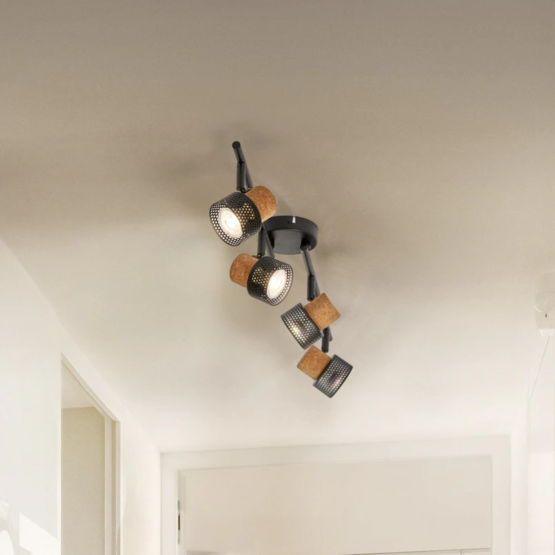 4-bulb Cork LED downlight with dimmable GU10 bulbs The Cork LED downlight in a long, two-part shape presents itself in a beautiful combination of materials. While the frame including the round canopy and the perforated lampshades are made of steel with a matt finish, the rear parts of the spotlights are covered in cork. The spotlight is supplied with a dimmable GU10 LED bulb, the spotlights can be both rotated and swivelled and the two arms, each with two spots, can also be swivelled. It is ideal for use indoors, for example in hallways and corridors, entrance areas, living rooms, kitchens and many more - versatile, adaptable and durable thanks to replaceable LED bulbs - high-quality housing with matt finish - dimmable OSRAM lamps included - easy installation - complete mounting and connection accessories included