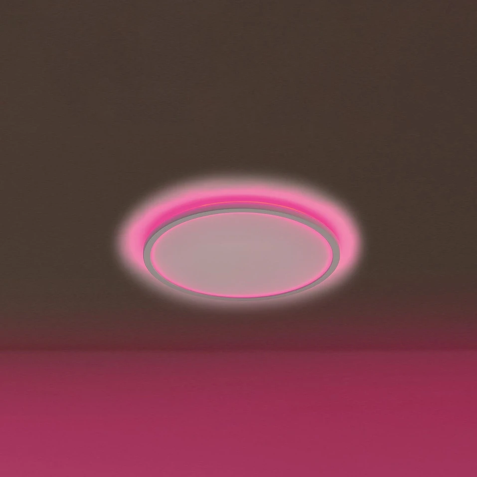 Round, extra-flat Orbis Ultra Slim Backlight LED ceiling light with LEDVANCE SMART+ WiFi technology The Orbis Ultra Slim Backlight LED ceiling light is made of plastic and consists of a narrow, round frame and flat, opal diffuser. In addition to the downward-emitting LEDs, further diodes are integrated at the back. Both light sources can be controlled separately. For example, effective room lighting in warm white to daylight white light colour with colourful ceiling illumination can be achieved. The brightness, light colour and colour temperature can be adjusted via an app on the tablet/smartphone or by voice command. The ceiling lamp is integrated using LEDVANCE SMART+ WiFi technology via WLAN. Technical data / compatibility: - Versatile adjustable light: Adjustable white light with 2,700 to 6,500 K and RBG light with 16 million colours in the frame to adapt the light colour to personal needs. The panel light is also dimmable - Easy installation: Simple & quick installation. Extensive mounting and connection accessories included - Smart control: Can be controlled with Smart+ WiFi remote control (not included), smartphone app or smart speaker. Compatible with Alexa, Google & others. Can be switched on and off with the light switch - Long service life: This LED panel light impresses with a long service life of up to 30,000 hours. With 25 watts and 2,940 lm, the light emits a very bright light. The product is energy efficient - Protection class IP20: Suitable for living rooms and study rooms. The IP20 protection class provides finger protection for live components. The light is not protected against water and moisture.