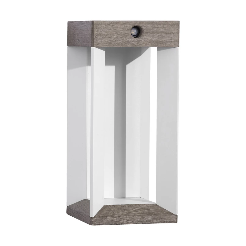 Modern design LED solar wall light Teckalu with motion detector The LED solar wall light Teckalu, made of teak wood and aluminium, is a modern lighting object for outdoor use. Thanks to the built-in motion sensor, the light is only switched on when it is needed and the built-in solar module ensures that the light is always supplied with energy. Three different modes can be set, giving the user a high degree of flexibility for outdoor lighting. In the first mode, the power consumption, power reserve and dark time parameters are monitored, which are used to adjust the brightness of the LEDs so that they can remain switched on throughout the night. In the second mode, the motion sensor is switched on and lights up automatically at dusk as soon as it detects movement. From sunrise onwards, the light no longer switches on. In the third mode, the light is switched on permanently and can burn for up to 5 hours when fully charged. The light intensity can be individually adjusted, extending the light duration to up to 200 hours. The motion sensor is off in this mode - Lighting duration: between 5 and 200 hours - Rechargeable with solar energy or via the mains using a USB cable