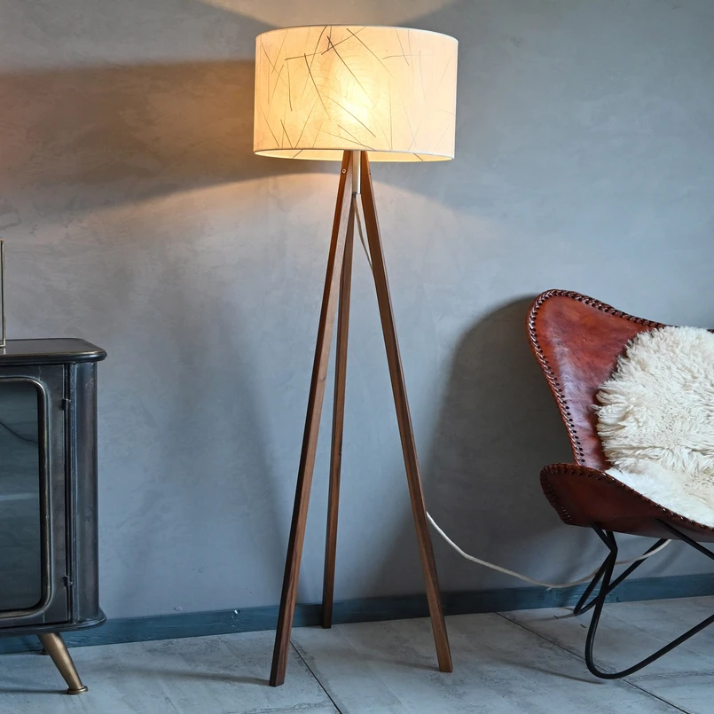 Floor lamp Ligno with tripod frame and rubber tree leaves shade