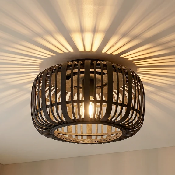 Canyana ceiling light with rattan shade in black The bulbous lampshade of the Canyana ceiling light is made up of individual rattan struts. The black colouring of the rattan gives the light a modern look and the struts create beautiful shadows in the surroundings due to the light emitted by the bulb. The ceiling plate of the light is made of metal and is fitted with an E27 socket in the centre. A beautiful look is achieved when a globe bulb with specially shaped LEDs is used as the bulb.