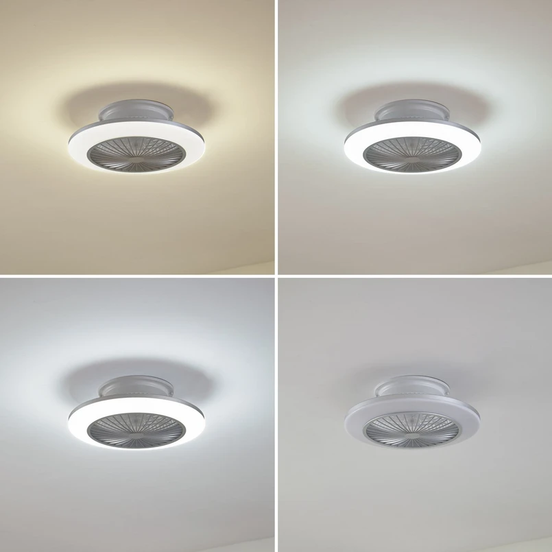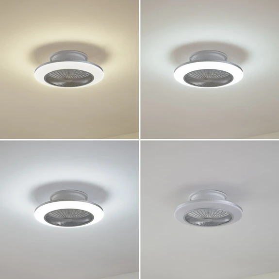 Modern ceiling fan with LED lighting, dimmable, controllable light colour The Mamuti LED ceiling fan combines modern design with great functionality. The LED lighting is dimmable by remote control and the light colour (white) can be controlled. The different speeds of the fan can also be controlled with this. Technical details Power per speed: - 35 watts at 1140 rpm - 30.4 watts at 950 rpm - 27.2 watts at 760 rpm - Maximum volume flow: 32.73 m³/min - Maximum air speed: 2.23 m/sec - Fan sound power level: 47.1 dB (A) - Service value (SV): 1.07 (m³/min)/W