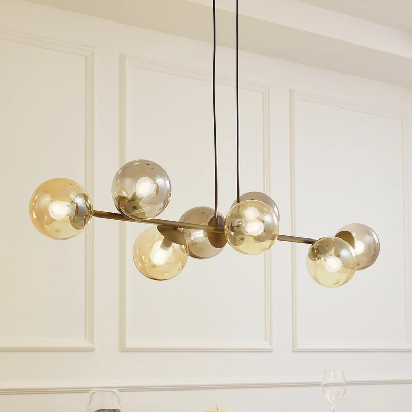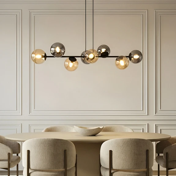 Isamer pendant light with spherical shades: Elegance in smoky grey and amber Discover the elegance of the Isamer pendant light, which brings a modern touch to living and dining rooms with its smoky grey and amber design. This pendant light is not only a stylish accessory, but also a mood creator that creates ambience with its light. Whether for a cosy get-together or an inspiring dinner - this light adapts to any situation. Please note that an external dimmer is required to adjust the brightness as desired and create the perfect atmosphere.