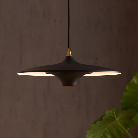 Moja LED pendant light with upward and downward lighting Moja is a beautiful and sleek pendant light created for a modern interior. The pendant light has a beautiful aluminium shade that is complemented with a brass plate and fabric cord - the result is a stylish and elegant expression. With its light and almost floating appearance, Moja is a pendant light that is ideal for modern spaces and environments. Despite its understated and minimalist design, it produces a beautiful light. The pendant light has integrated LED lighting with direct and indirect light distribution, creating both functional light upwards and downwards and a pleasant atmosphere.