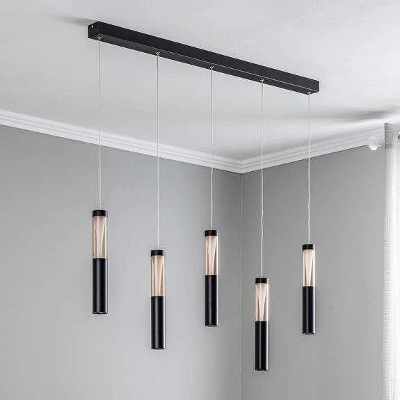 Five-lamp LED pendant lamp Danson with black shades in the shape of a cylinder - great look for modern spacesDanson is a LED pendant lamp with five narrow lampshades hanging from an angular ceiling bar, each resembling a tube and with a modern two-component look. The lower part and a smaller element above are black, while in between there is an insert made of plastic, which is partly clear and moreover integrates an element made of satin plastic. This ensures not only an extravagant look, but also a pleasant and cozy light, because behind the plastic sits warm white LEDs, whose light is distributed evenly in this way. However, this is not the only light source per shade, because also at the bottom sits one LED each, which emits its light bundled and targeted downward, so that the dining table in the living area or in the kitchen can be brightly and pleasantly illuminated without causing glare. With the particularly good color rendering index of the downward-facing LEDs, the most unadulterated color rendering possible can be guaranteed, even when daylight has already taken its leave.