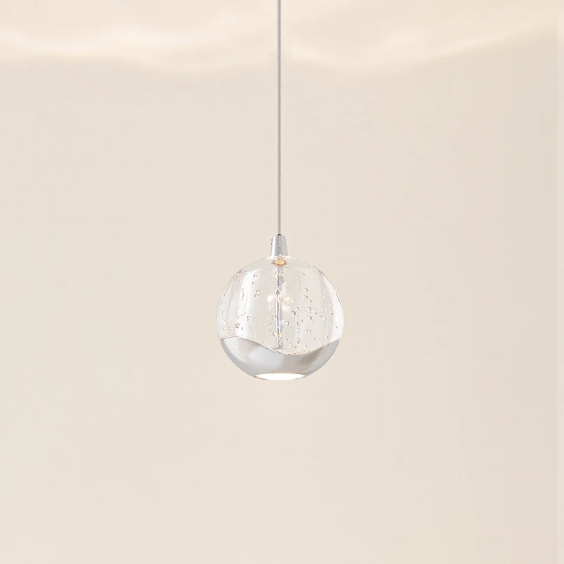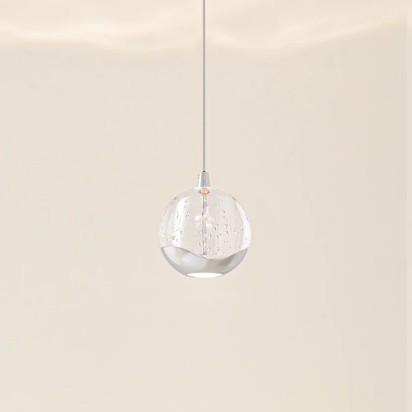 Hayley single-bulb LED pendant light with chrome-plated elements and bubble glass sphere The Hayley pendant light undoubtedly has a very modern look and is a compact light source for many living spaces with modern furnishings. The lampshade is spherical and consists mainly of glass with an attractive bubble structure. Only the lower part is complemented by a metal element, which, like the ceiling canopy, is bright chrome-plated. The light is emitted both directly and indirectly. There is a white cover where the light is emitted directly, ensuring soft light distribution with a very cosy effect. The LEDs in the hanging light are highly efficient and consume very little electricity despite their adequate light output.