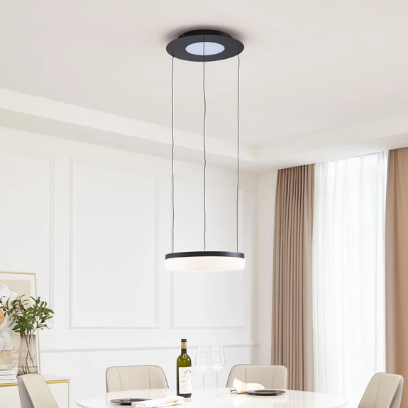 Black Squillo LED pendant light, dimmable, RGBW, smart control via Tuya This modern design Squillo pendant light from Lucande consists of a wide ring that is attached to the round canopy with three discreet cables and forms the lampshade. The black ring, which contains the light source, creates a very pleasant, glare-free light with a wide range of adjustment options. You can control the LED hanging light using the remote control supplied or via the free Tuya app, which is compatible with numerous products. In addition to the dimmability and adjustability of the light colour, you also have the option of setting scenes or automations and adding them to certain schedules. The round additional light source, which is integrated into the canopy, can shine in many bright colours.
