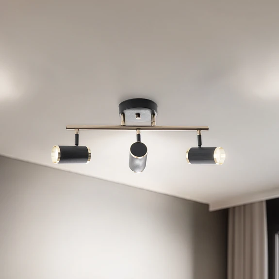 3-bulb downlight Lumens - Linear ceiling spotlight Discover the elegance and functionality of the Lumens downlight, whose linear shape and appealing colour combination of black and brass-coloured metal is not only a visual highlight, but also versatile. Manufactured in Europe, Lumens stands for quality and local craftsmanship. Whether in the living room, dining room, bedroom, kitchen or hallway - this 3-bulb downlight is an enrichment for any room. With its simple yet sophisticated design, Lumens blends seamlessly into various interior styles and offers the opportunity to set accents with targeted lighting.