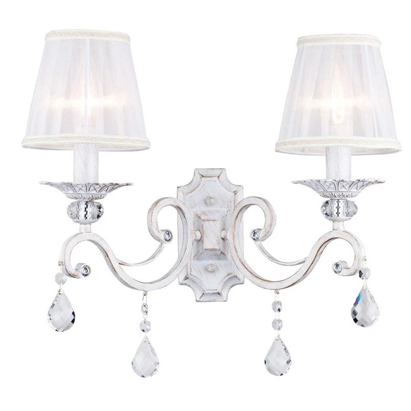 With crystal pendant - 2-bulb Grace wall light Stylish and playful at the same time: the Grace wall light combines a vintage touch with light elegance. Its two lampshades are made of slightly transparent, white organza, which creates a special glow. These two lampshades are enthroned on the metal frame of the wall light, which has a very ornate, decorative and shabby-style look. The shabby look is skilfully combined with the sparkle of the crystals, which are incorporated as components and integrated as hangings on the light. The Grace wall light is a special lamp that is a decorative eye-catcher and additional source of light. Whether in the living room, dining room or hallway, the 2-bulb wall light can be used in a variety of ways.