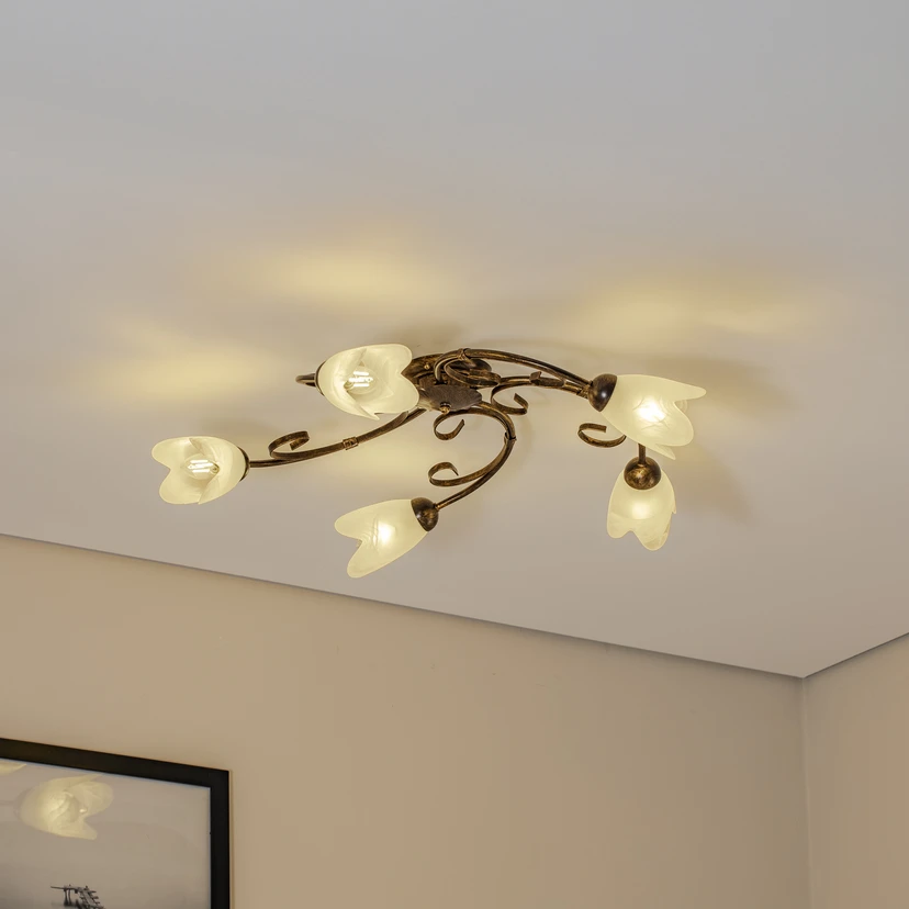 The Odino ceiling light combines bronze-coloured metal and white glass in its design, giving it a special touch that will enhance any room. With its five light sources, it provides even and pleasant lighting that is ideal for living rooms, dining rooms, hallways and bedrooms. The light is manufactured in Europe and stands for quality and craftsmanship, making it a special highlight in any interior design.