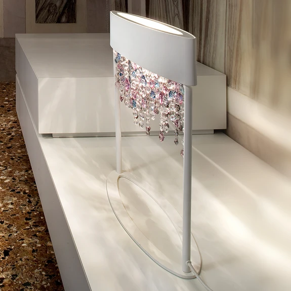 The table lamp Ola TL2 consists of a standing base with an oval metal element above it, which has been attractively painted and serves as a frame for the illuminant. Within the metal frame can be discovered finely crafted and lacquered glasses, which shimmer many times and allow an atmospheric environment through the illuminant above. An aesthetic luminaire that is capable of setting the stage for any living space in a representative, artistic and exceedingly unusual way.