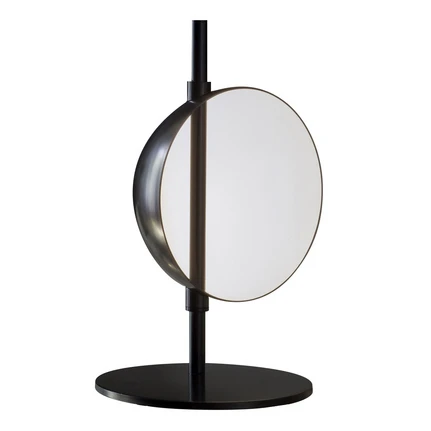 Superluna LED table lamp with movable, semi-circular shade The Superluna LED table lamp has a special shade - a hemisphere that is open to the side and whose inside is brighter than the outside. It is visually cut through by a slender rod that is mounted on the round Basis. The warm white LEDs, which are orientated towards the inside of the lampshade, are integrated into the rod. The lampshade thus acts as a kind of reflector and emits the light over a large area outwards, to the side. In addition, the reflected light has a glare-free and indirect effect and is able to lend a room accentuated lighting effects. The hemisphere can also be moved, allowing the light beam to be individually aligned. Superluna was created by the long-established Italian company Oluce using an integrated switch. Designer lights have been produced there for over 70 years. Oluce is one of the oldest active design companies in the lighting sector from Italy. They always strive to ensure that their lights are sought-after furnishing objects across all generations.