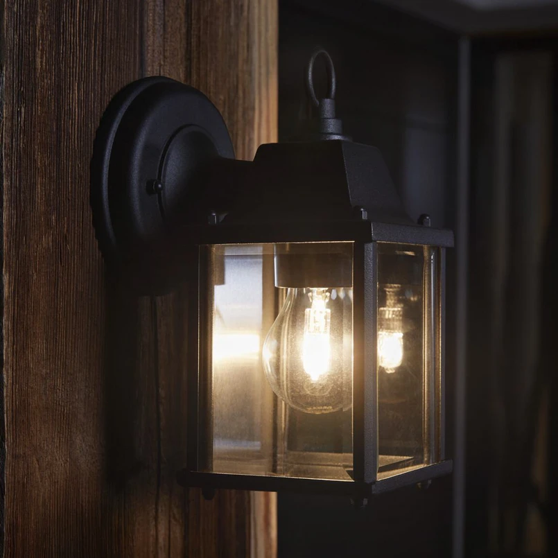 Classic square-shaped lantern. Product features: Die-cast aluminium housing. Clear glass diffuser. IP code: IP23. Product advantages: High flexibility in the choice of bulb thanks to E27 socket. Quick and easy installation. Areas of application: Only for specially protected outdoor areas. Suitable for outdoor applications with luminaire mounting with downward-facing socket. Entrance lighting. Terraces, balconies. Technical features: Complete mounting and connection accessories included. No bulb included. Safety instructions: All electrical connections must only be carried out by qualified personnel. Caution, risk of electric shock. Product of protection class I. All electrically conductive, metallic housing parts that can become live during operation or maintenance in the event of a fault must be connected to the protective earth throughout.