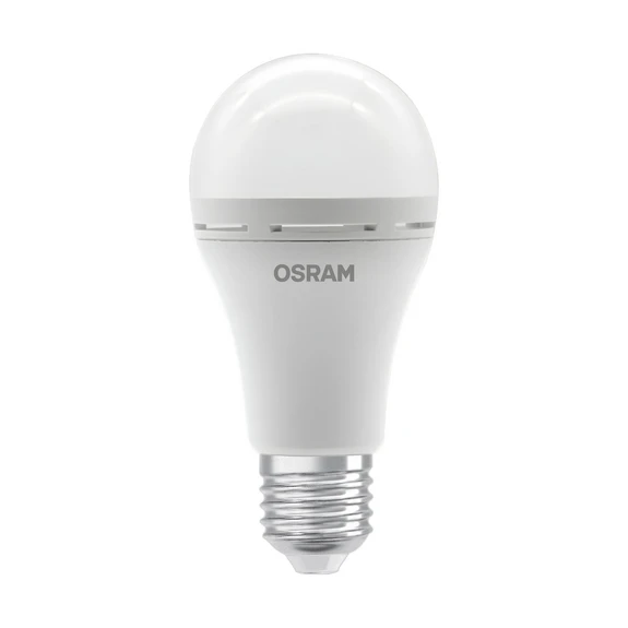 LED bulb E27 8W matt 4,000 K with rechargeable battery This standard LED bulb with E27 base from OSRAM with integrated, rechargeable battery acts as emergency lighting in the event of a power failure and provides cool white light for up to 3 hours. The integrated rechargeable battery is automatically recharged when the bulb is in use in a socket. The bulb is suitable for general lighting applications in the home and acts as an emergency light for up to 3 hours without a power supply. It is also suitable for use without a mains connection, such as in the cellar, when camping or in the garden. The lamp cap is suitable for use as a torch. In a power failure situation, the lamp can be switched on at the touch of a finger or by using the cap - Capacity of the integrated lithium battery: 1800mAh - Charging time: 8 hours to reach almost full capacity