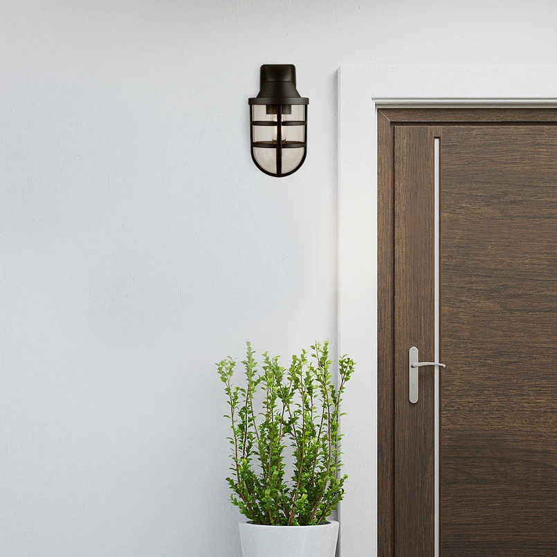 Outdoor wall light X Seaside in cage shape, IP44 The outdoor wall light X Seaside is a stylish and functional lighting solution that impresses with its cage design. It is made of polycarbonate and is protected against splashing water thanks to its IP code IP44. There is space for a candle-shaped E27 bulb (not included, see accessories) inside.