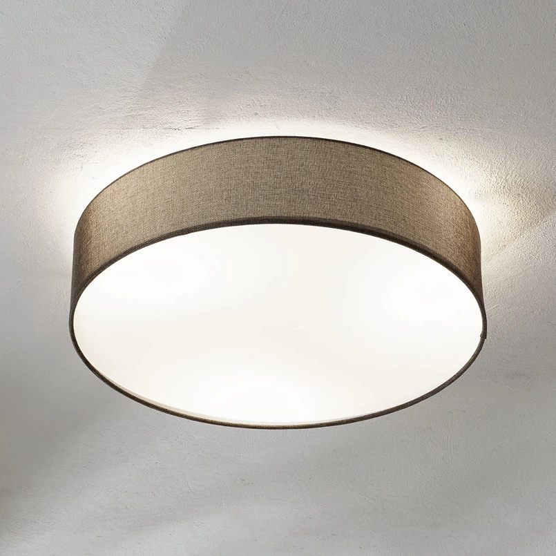 Pasteri - round ceiling light with brown linen lampshade The flat, round lampshade of the Pasteri ceiling lamp is made of linen. The coarse structure of this fabric allows the light to shine through gently and is particularly effective when the light is switched on. In combination with the white diffuser, which closes the lampshade at the bottom, the result is a modern yet simple light source that can be used for ambient lighting in many rooms, whether in private living rooms or bedrooms or in hotels or shops, to name just a few examples. Energy-saving lighting can be achieved with the ceiling light if modern LED bulbs are used instead of traditional light bulbs (see accessories).