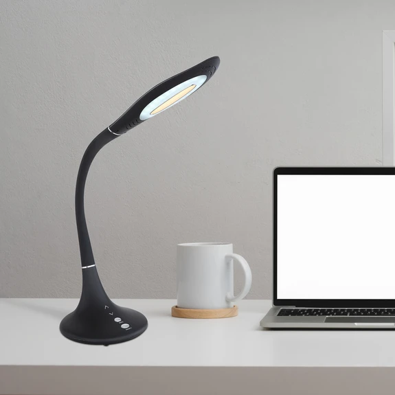 The Pattaya LED desk lamp finds its perfect place in a study. It consists of two metal elements that are connected with a flex arm. Its black colouring rounds off the simple design of the lamp benevolently and integrates easily into a wide variety of furnishing styles. In addition, Pattaya has a touch dimmer, via which it is not only dimmable, but can also change its light colour in several stages. The LED desk lamp Pattaya can be placed flexibly in the room with its power cable and its flexible arm allows an optional alignment of its lampshade and thus also of the generated light.