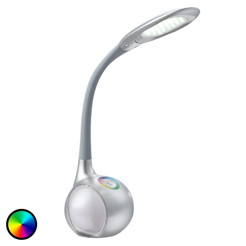 The Paula LED table light has a futuristic design and impresses with its various functions. Its lamp head transitions into a flexible arm and be oriented where necessary as a result of this. Its illuminated base is unique. It is illuminated in various colours because of an integrated colour changer. It is also possible to freeze a specific colour. The lamp can be conveniently operated using the touch dimmer.
