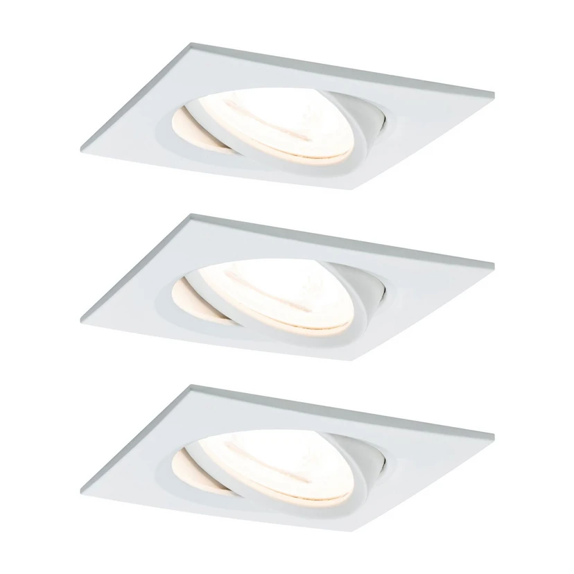 Swivelling and dimmable in 3 levels - the angular Nova LED spots in a set of 3 The Nova spots create a completely individual lighting concept in modern rooms, as they can be placed at a distance of your choice and fixed in place by simply installing them in the ceiling with retaining springs. The square LED spots are made of aluminium and fitted with replaceable LED bulbs (GU10). The warm white light is directed into the room with a 50° swivelling range and can be dimmed to three levels using a standard light switch. Nova is equipped with IP23 spray water protection.