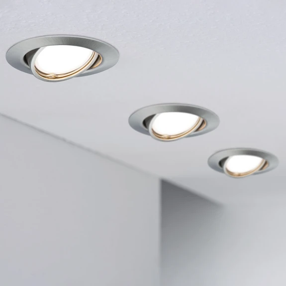 Base recessed spotlights are robust and user-friendly recessed luminaires made of metal, which are suitable for new installations as well as for the replacement of existing recessed spotlights. Thanks to 230V direct connection, the luminaires can be interlinked without any restrictions. The basic set consists of three recessed luminaires with Coin LED bulbs, which can be replaced. The LED recessed lights can be switched in three brightness levels via the standard light switch and can be swiveled to direct the light optimally.