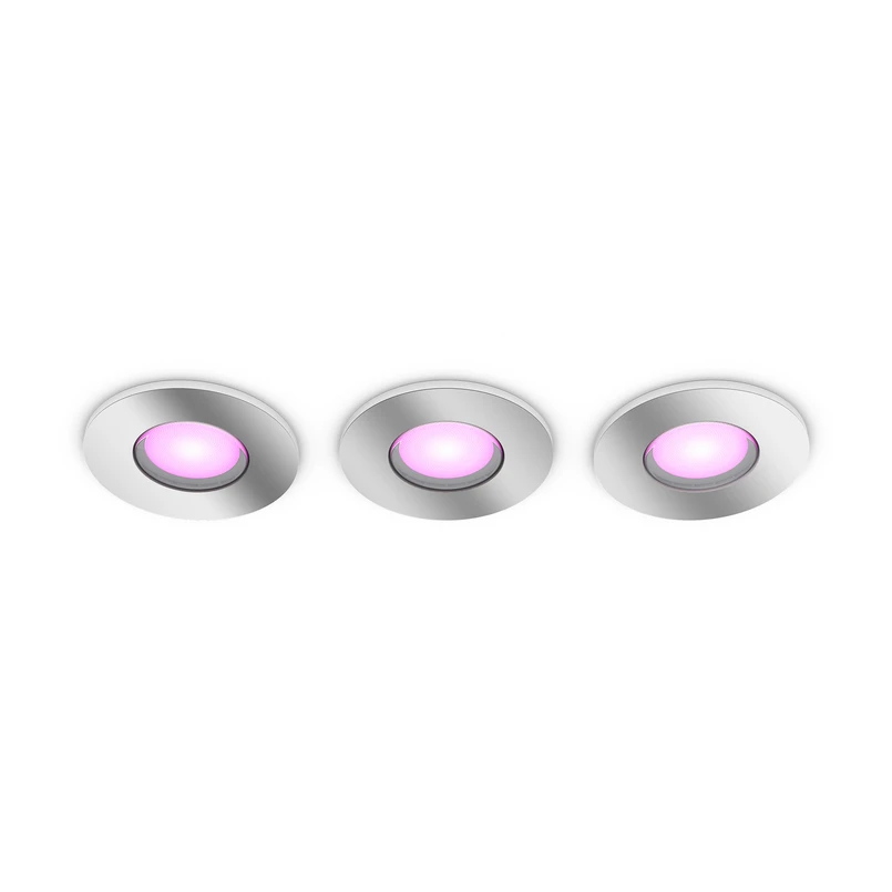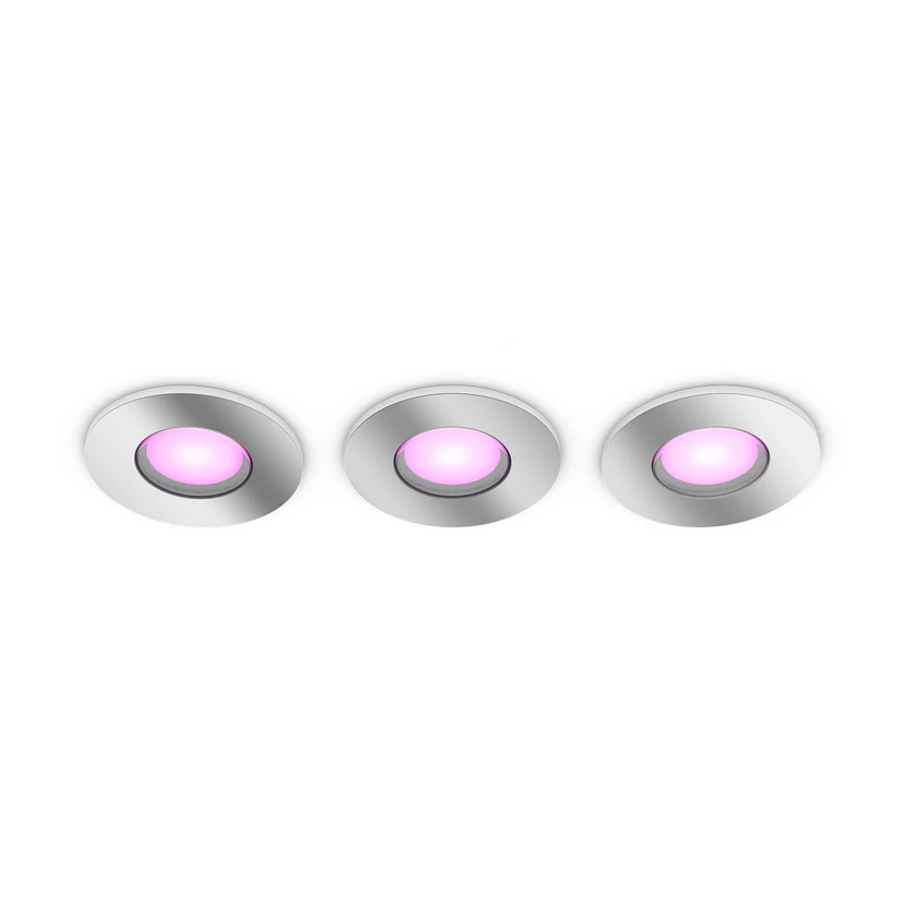 In a set of 3: Round Philips Hue LED recessed spotlight Xamento - coloured and white light, smart controllable, IP44 The round LED recessed spotlight Xamento from Philips Hue provides coloured or white light, creating a decorative and cosy lighting mood. Whether installed in the living room, bedroom or bathroom, Xamento is suitable for all dry and damp living spaces and also offers visual added value with its frame that stands out slightly from the ceiling. This set contains three recessed lights and the integrated LEDs are versatile and can also be controlled smartly. With the help of the matching Hue dimmer switch (see accessories), the basic functions such as on, off or dimmable, as well as four preset light scenes, can be conveniently switched. Thanks to Bluetooth technology, the recessed spotlights can also be controlled directly using a smartphone/tablet and the free Hue Bluetooth app. The integration of the Xamento LED recessed spotlight into an existing ZigBee-based smart home system (bridge required) provides greater convenience and a variety of additional functions. This makes it possible, for example, to set up voice control, switching according to schedules, together with other smart devices or access while travelling.