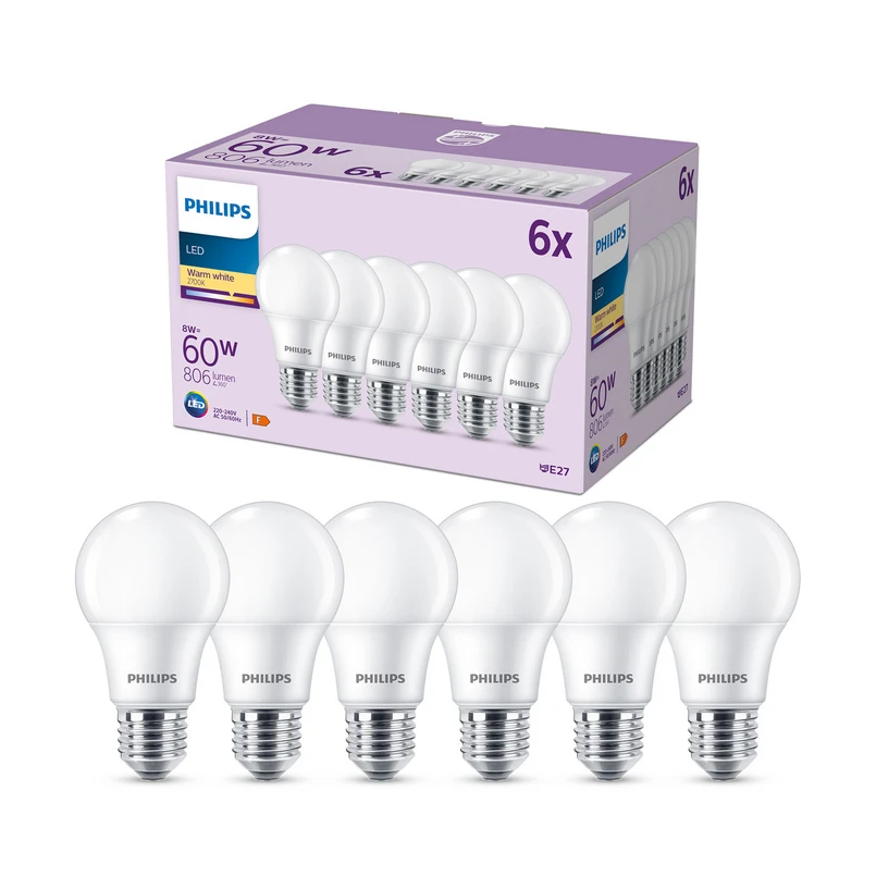 E27 LED bulb, 8W, 806lm, 2,700K with matte plastic bulb, in a set of 6 This LED bulb A60 with E27 base replaces conventional incandescent lamps with 60W. Due to the matte bulb, the warm white light is emitted homogeneously to all sides. - Supplied in a pack of 6 - not dimmable - high switching resistance: 50,000 cycles