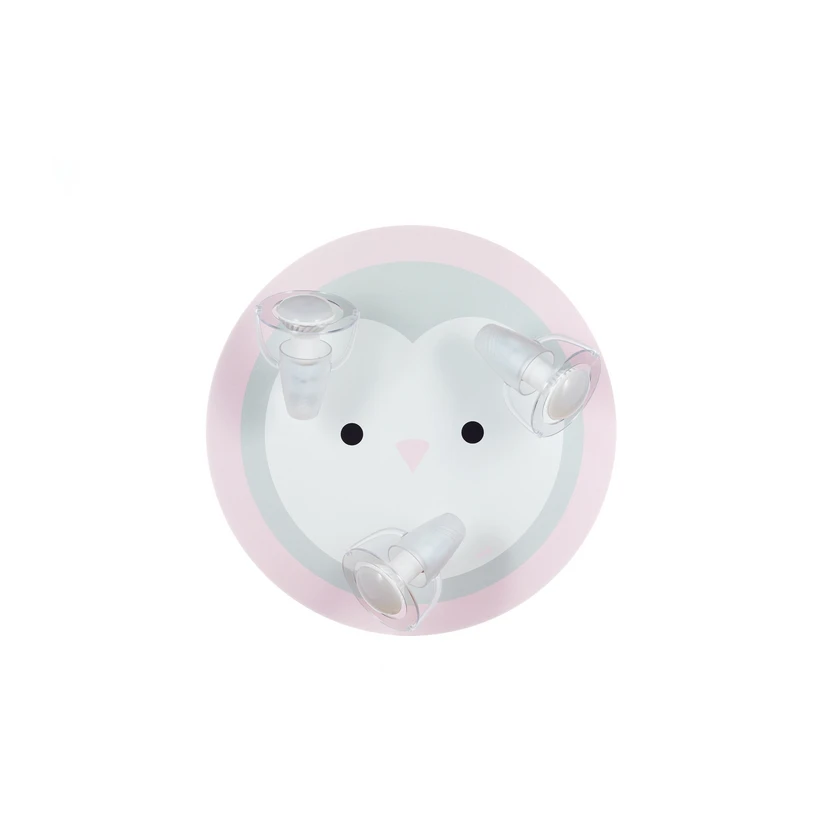 Penguin ceiling light with three spotlights and rose-coloured edge The round ceiling plate of the children's ceiling light Penguin has been cut out of wood and printed with a pink, grey and white penguin face design. Three transparent plastic spotlights with a clear Ring are distributed across the ceiling plate and can be rotated and swivelled into the desired position so that different areas of the children's room can be illuminated in a targeted manner. The spotlight is suitable for E14 reflector bulbs up to 40 W, bulbs are not included.