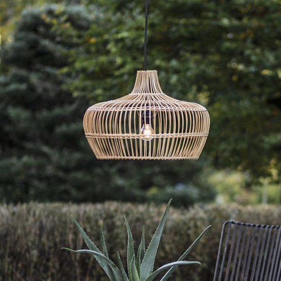 Elegant Kisha pendant light for patios and balconies Kisha is a rattan pendant light with a very natural look that blends harmoniously into the outdoor area. The wickerwork lends a warm and cosy feel, as the light can gently escape through the gaps and create an atmospheric light pattern in the surroundings. The colour and finish can be affected by weather conditions, which is why it is recommended to install the pendant light in a covered outdoor area.