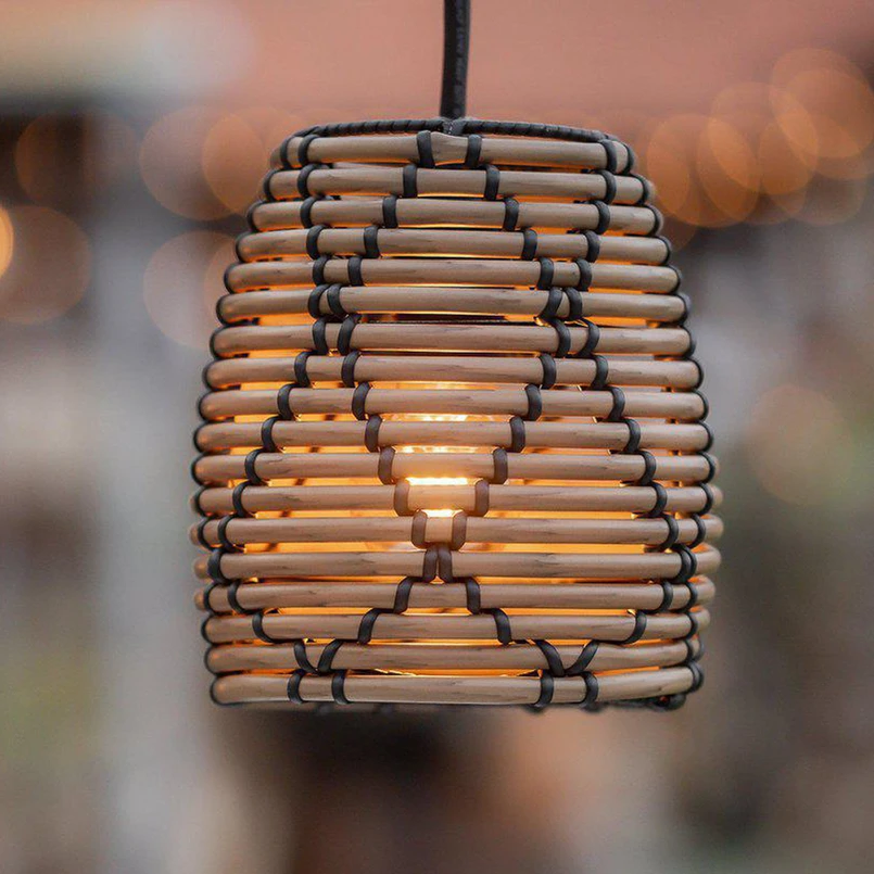 Lollo pendant light for patios and balconies in a natural colour Lollo is a small, beautifully designed polyrattan pendant light for outdoor use. The Lollo lampshade has a round, thicker polyrattan weave with black threads to emphasise the modern look. Polyrattan is a durable material for outdoor use. The woven structure creates a beautiful, atmospheric light