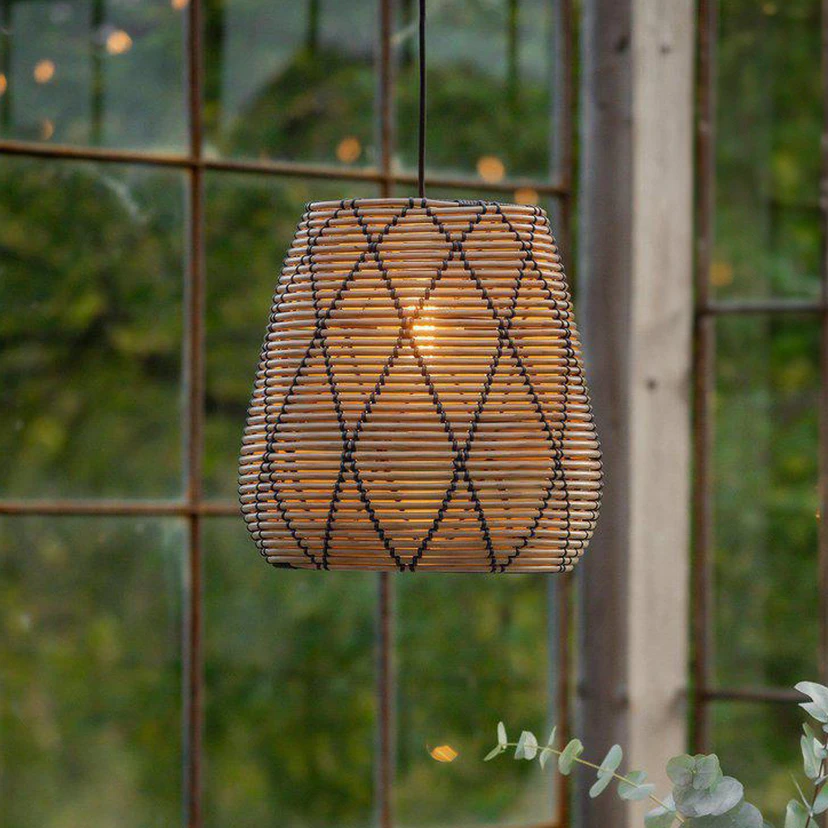 Lollo pendant light for patios and balconies in a natural colour Lollo is a small, beautifully designed polyrattan pendant light for outdoor use. The Lollo lampshade has a round, thicker polyrattan weave with black threads to emphasise the modern look. Polyrattan is a durable material for outdoor use. The woven structure creates a beautiful, atmospheric light