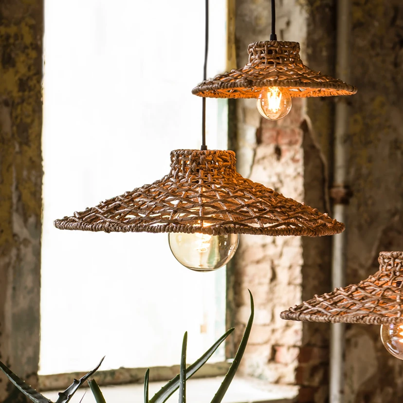 The Sari hanging light is made from a very special material called lampakanay. This is a marsh plant known in our part of the world as cattail. The fibres are very strong and durable, making them ideal for weaving. And you can see that in this special hanging light – bring pure nature into your home! The lampshade filters the light and creates a beautiful play of shadows. The light fits wonderfully in a conservatory or interior and creates a down-to-earth ambience. The black plastic cable is approx. 1.2 m long. The pendant light has an E27 socket. Weather and UV light can affect the appearance of the light