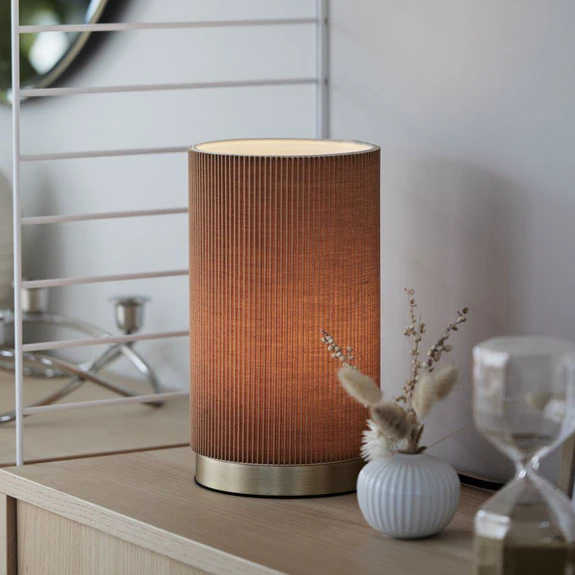 Elegant Dora table lamp by PR Home Stylish, cylindrically shaped table lamp with a fixed lampshade made of pleated polyester and cotton material. The laminate on the back of the lampshade is made of polystyrene plastic. The base is made of metal and painted in a matt gold tone, which emphasises the elegance of Dora. The table lamp is equipped with a 1.5 metre long, black textile cable with a flat plug and switch.