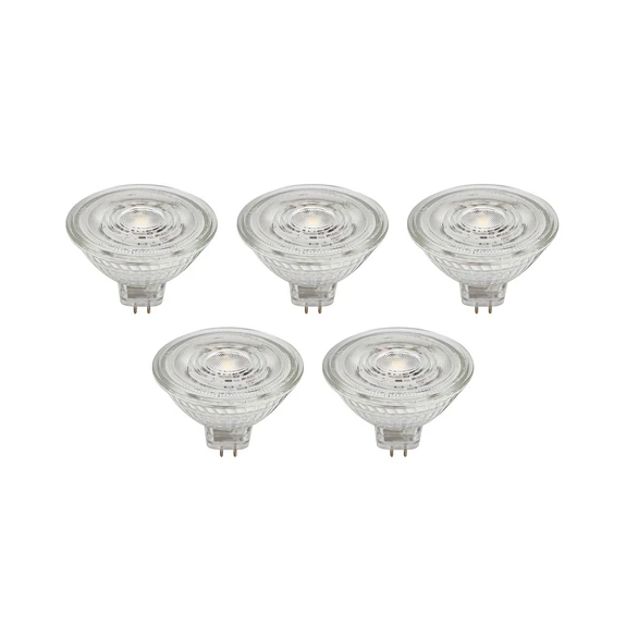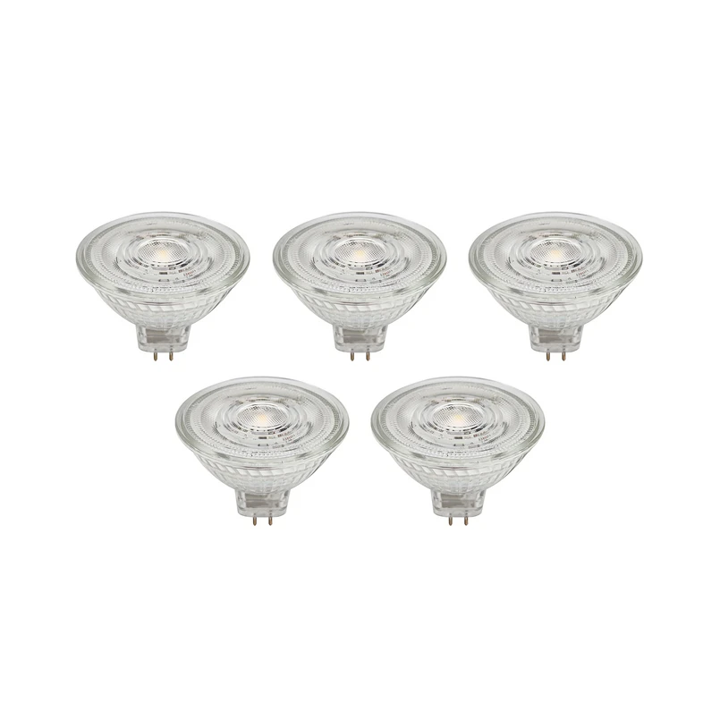 GU5.3 LED bulb made of glass, transparent in a practical set of 5 This LED bulb is suitable for numerous lights with a GU5.3 socket. It is made of glass and can be used flexibly thanks to its transparent colour design - not dimmable - 4.3W - 345 lumens - beam angle 36° - supplied in a set of 5