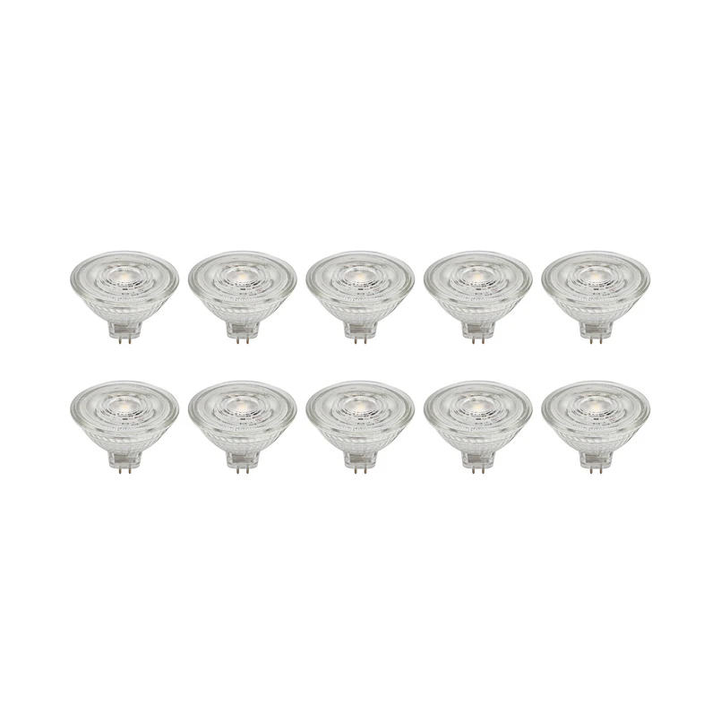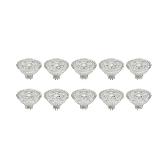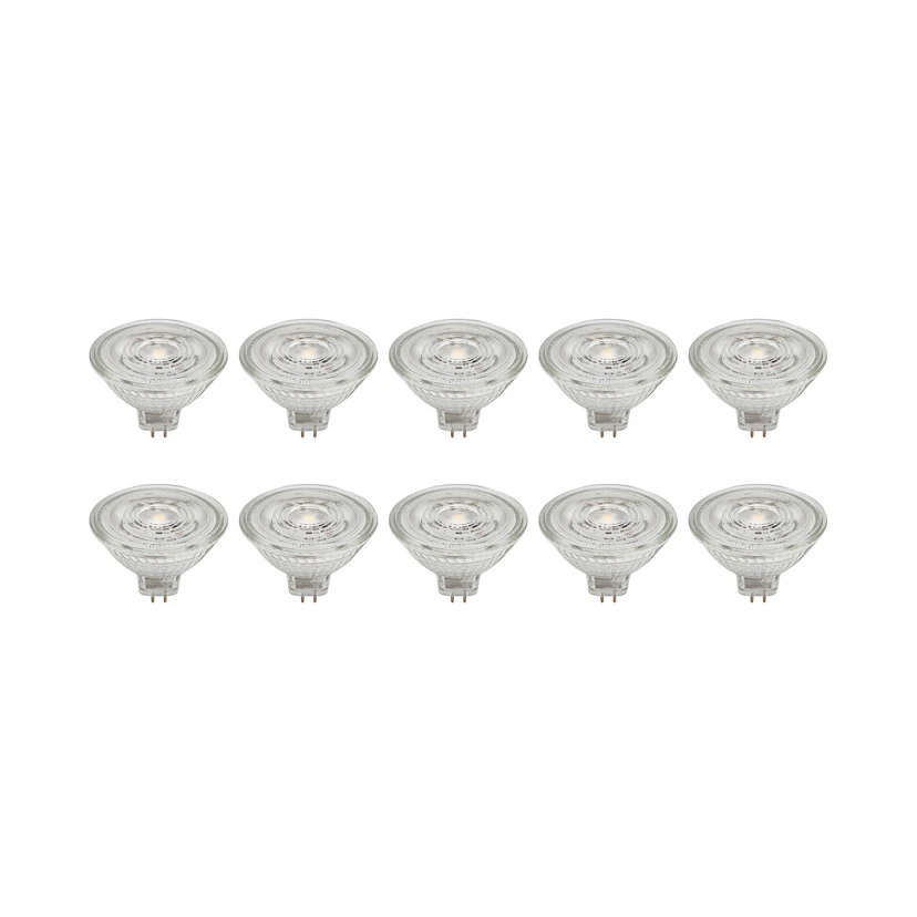 GU5.3 4.9W LED bulb made of glass, transparent in a practical set of 10 This LED bulb is suitable for numerous lights with a GU5.3 socket. It is made of glass and can be used flexibly thanks to its transparent colour design - not dimmable - 4.9W - 500 lumens - beam angle 36° - supplied in a set of 10