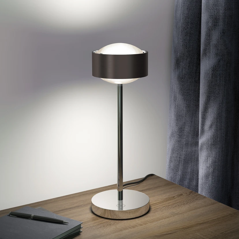 Puk! 120 Eye Table - elegant, compact light dispenser in the form of an LED table lampThe LED table lamp Puk! 120 Eye Table is not only a practical source of light, but also a stylish decorative element. It is made of aluminum and carries on its slender frame a round lamp head, which can be rotated. This radiates the warm white light of the installed LEDs upwards and downwards.The inserted matte lenses create a homogeneous, broadly diffusing light with a slightly suggested light cone, thereby creating a particularly pleasant mood. This is further emphasized by the particularly high color rendering (RA 95), making the colors look very natural.On its base is a touch dimmer via which the brightness can be easily adjusted. It is equipped with a black textile cable and the switch on and off is also via the button.- Made in Germany- 360 ° rotatable lamp head- easy to assemble and replace the accessories due to new spring technology- more homogeneous light due to fixed satin lens on the underside- extremely insensitive surfaces due to new PVD colors