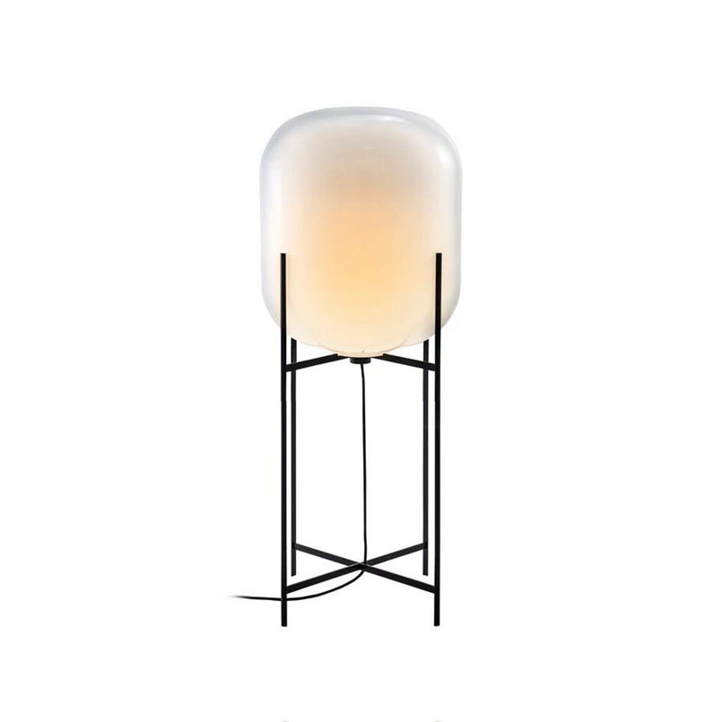 Designer floor lamp Oda made of hand-blown glass A slender base embraces a bulbous shape. An industrial motif, softened by the gentle curves of the hand-blown glass. The floor lamps in the Oda series reference the stilted shapes of silos, ovens and water towers of a bygone era. The Oda floor lamp is a masterpiece of traditional craftsmanship. Each light is handmade and has characteristic features such as irregularities in the thickness of the glass, colour deviations, small bubbles or unevenness in the glass or the base.