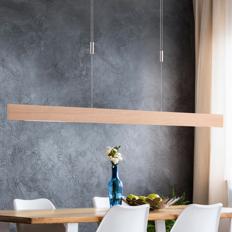 Narrow, height-adjustable LED pendant light Lise made of light-coloured, solid oak wood - a high-quality product made in Germany The LED hanging light Lise is ideal for use above the dining table, as it provides large-area illumination of the table surface. The Massive body made of oak wood has an extremely slender appearance, not least because of its tall shape, and is characterised by an absolute straightforwardness that is popular in modern, purist living spaces. The height of the suspension can be adjusted as desired from 105 cm to 195 cm using a cable pull construction. The surface of the wonderfully natural-looking oak wood has been painstakingly finished by hand with the utmost precision, resulting in an extremely presentable appearance that impresses across the board. For maximum convenience during installation, the Lise LED pendant light has been provided with an extra-large connection compartment that offers enough space for the connection terminals and cabling. The warm white LEDs of the light are characterised by very good colour rendering with a CRI of over 90 and they are also absolutely efficient, so that the operation of the hanging light requires little power but provides maximum luminous efficiency so that the table is brightly and sufficiently illuminated. The use of an external dimmer (phase on or phase off) makes it possible to precisely regulate the light output if the light needs to be less bright and more cosy. The LIS pendant light is a top-quality lighting product manufactured in Germany, which, with its natural radiance and high-quality oak wood, is a wonderful addition to an upscale ambience.