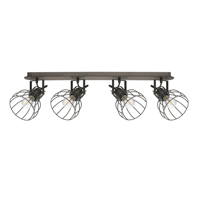 Ceiling lamp Sambatello in brown and silver A real eye-catcher is the ceiling lamp Sambatello. The modern industrial design gives this lighting object that certain something. The flexible joints of the four sockets make an optimal illumination possible and thus offer individual light accents. The lamp is made of steel and wood and is attached directly to the ceiling with the suspension. Particularly appealing is its simple color scheme in brown and silver. The thin steel struts of the four lampshades in cage design complement the minimalist design. This is completed by the pleasant light image to a coherent overall picture.